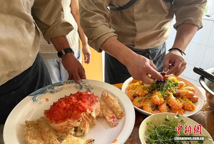 当日中博策略,两名厨师自带食材上门。一人专注于食材处理,将帝王蟹拆解为小块方便老人食用;另一人负责烹饪摆盘,为芥末虾球等菜品搭配青柠片、香椿苗及三色堇点缀。
